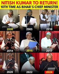 | 2022 | Left NDA again, allied with RJD, Congress, Left parties; became CM for ninth time |
